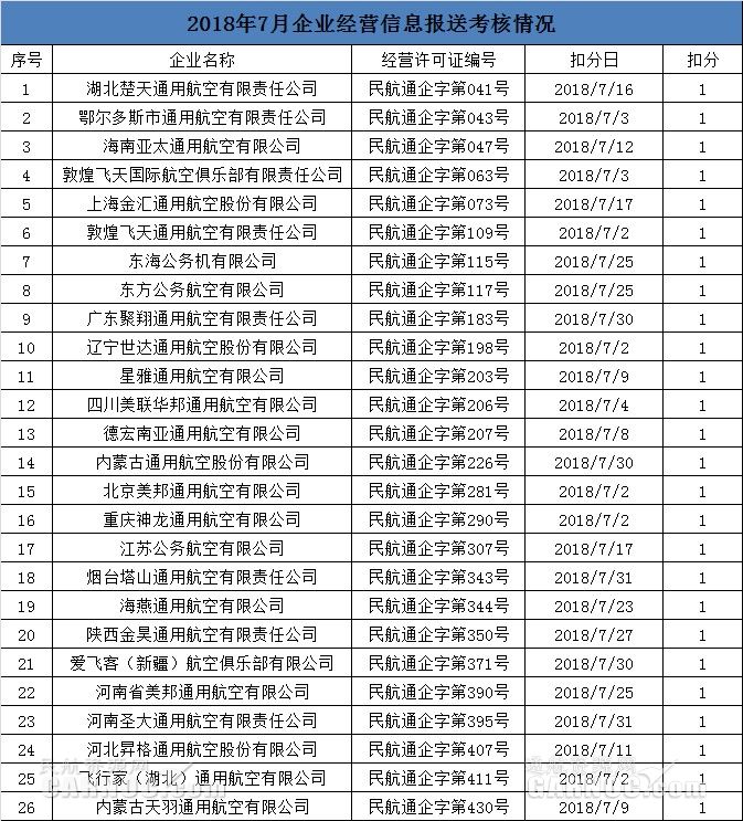 2018年8月15日,民航局通用航空管理系統發布了《2018年7月企業經營信息報送考核情況》,包括26家通用航空企業的考核結果。