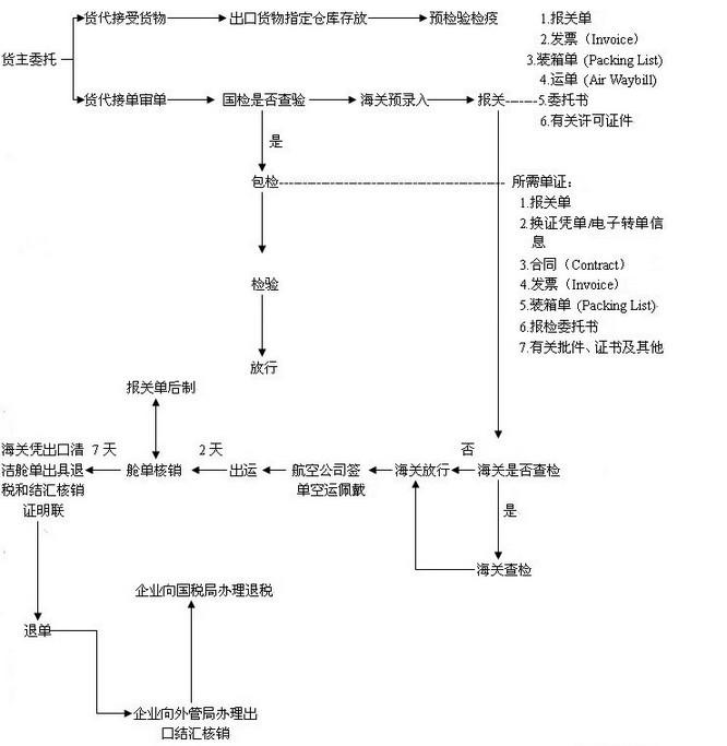 發貨人下單---客服專員---委托書---訂艙---進倉通知---單證進倉---貨物進倉----核對數據---提單確認---制單----報關----海關預錄---申報---海關審單---查驗---放行----打板/裝箱---排倉---裝機---航班起飛----途中跟蹤---到達機場---目的港清關---提取貨物----核銷單退回---發貨人核銷